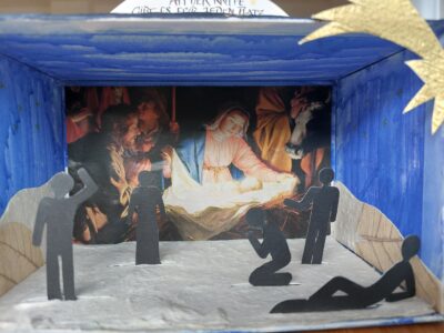 nur als Silhouetten zu sehen, sind unterschiedliche Körperhaltungen auszumachen. Einer steht nur dort, ein anderer winkt und versucht, die Aufmerksamkeit auf sich zu lenken. Oder fasst er sich an den Kopf, zeigt den Vogel? Auf der rechten Seite steht eine Gestalt, die auf die Krippe weist, ein anderer kniet nieder und betet an. Ganz vorne liegt jemand ganz entspannt: er lässt sich von der Szene im Hintergrund nicht aus seiner gleichgültigen Position herausbringen.